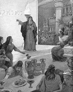 Belshazzar had no idea what was about to happen. He believed he was safe. So safe that he threw a party. He invited thousands of people to attend and it was a grand party indeed. Singing, dancing, drinking, carousing with wives, concubines, and slaves. He took pride in his ability to party in fact and thought that in order to be funny, or to be rebellious, he and his guests should drink their wine from the vessels taken by Nebuchanezzar from the Temple in Jerusalem.